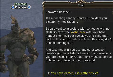 2.Khavatari Rosheek se nachází ve Frozen Waterfalls.Pošle tě získát pět Claws od Kasha Bear.(Musíš použít fisty).Po nasbírání se k němu zase vrat.