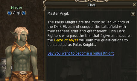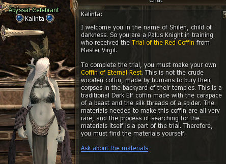 4.Kalinta ti dá coffin.Pak běž za Virgilem do Gludia.Poté běž za Grand Master Tobias (nebo jiným Dark Elf GM) a nech se povýšit na Palus knight.